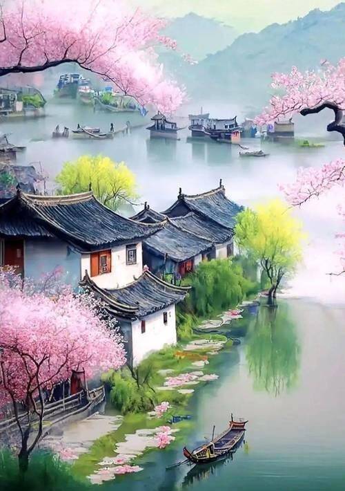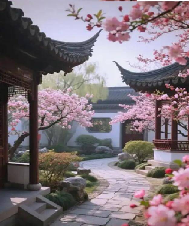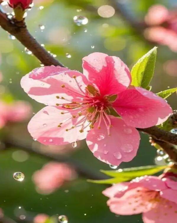 一个“争”字尤为精妙,鸟儿仿佛一群歌者,在枝头争相吟唱,比拼歌喉,既写出一份活泼灵动,也渲染了春日山庄的生机与喧闹;一个“拖”字精准传神,既刻画了雨珠附着在花瓣上的静态,又展现出雨后桃花的娇美。