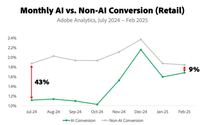 就转化率(访问最终变成购买)而言,来自生成式AI的流量目前仍比其他来源低9%。然而,这一差距已大幅缩小——2024年7月时差距高达43%。