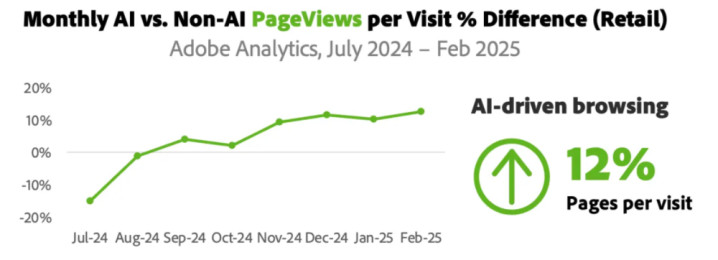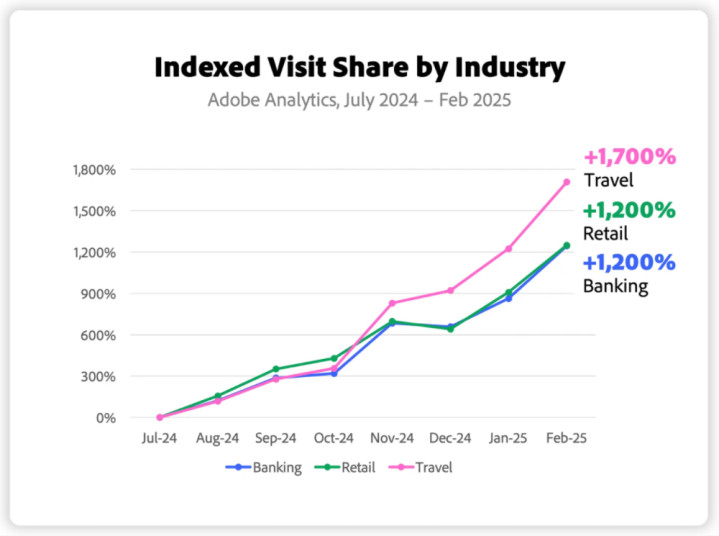 据Adobe Analytics 2025年3月发布的报告,2024年7月至2025年2月,美国来自生成式AI来源的流量增长了1200%。尤其在2024年假日购物季至圣诞期间,增幅一度高达1950%。