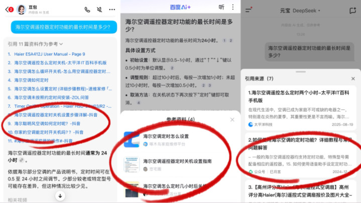 国内的一些AI搜索产品已经在悄然展示它们的“偏好”:百度“AI搜”里提问,经常跳出的结果是多篇百家号文章;在豆包,答案链接往往指向抖音视频;在元宝,AI生成的内容附着的是微信公众号图文。