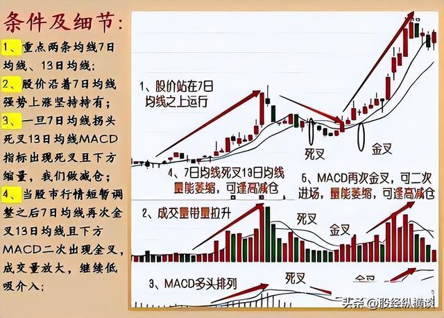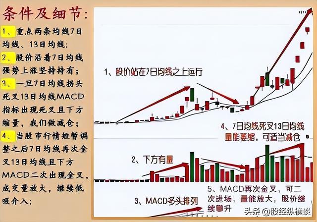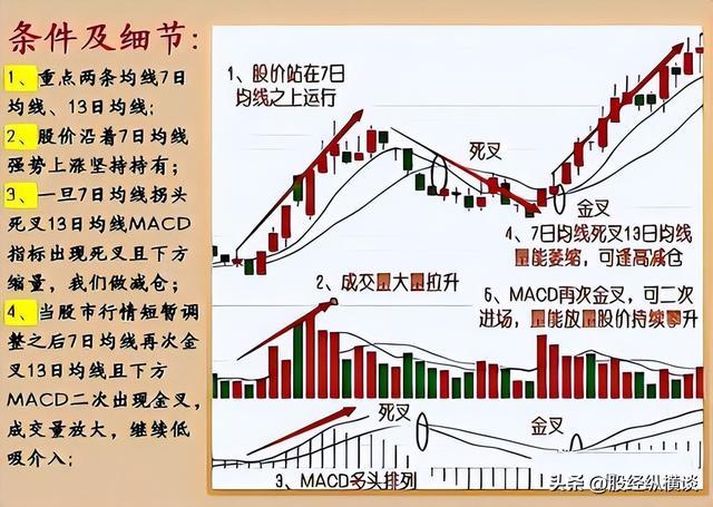 股价在回升趋势初期,小周期线金叉13天线,则是初次的介入点。此时,在回升趋势中会温和的放量,7日线在13日线上方,构成双双齐飞态势,此时就是波动持有。在回升途中,7日线逐步拐头向下,死叉13天线,量能开端萎缩,就要逢高减仓了,这是因为短线开端走弱,初次的上扬已经结束,后面的行情走势则需要配合MACD来帮忙。