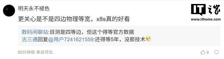 后续有用户在评论区询问:“小米呢[狗头斜眼]”,博主回复道:“粮厂外观也都知道了吧[狗头斜眼]”;另一位用户则询问道:“更关心是不是四边物理等宽,x8s真的好看”,博主则回复道:“目测是四等边,但这个得等官方数据”。