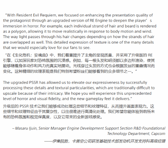 “我们一直在努力开发新版PSSR,它不仅在神经网络方面,而且在整体算法上都采用了截然不同的方法。我们很高兴地宣布,今日发售的《生化危机:安魂曲》是首款采用这款更先进PSSR技术的游戏,它有助于同时保持高帧率与高画质。以下是卡普空的伊集院胜先生,分享关于这款游戏所使用的升级版 PSSR 的见解: