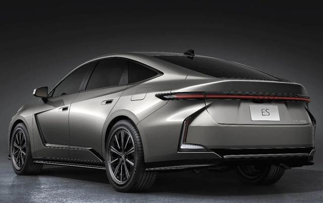 车尾部分,新车采用贯穿式尾灯组,品牌标识嵌入灯带之中,点亮后辨识度出众。尾灯两侧保留空气动力学导流设计,延续品牌设计理念。下包围通过凌厉线条塑造运动质感,搭配隐藏式双边共两出排气布局,车尾标识显示混动版定名为ES 300h。